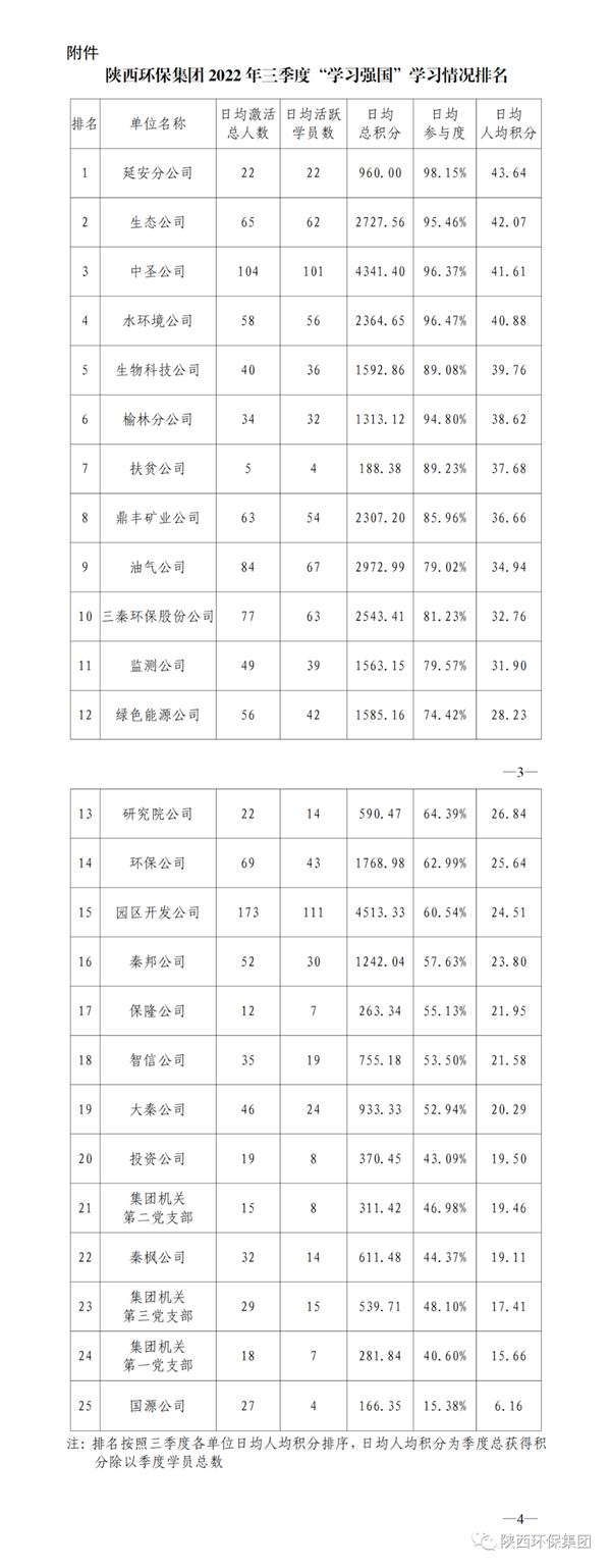 三季度,陜西環(huán)保集團(tuán)整體平均參與度為72.21%,日均人均積分30.12分,日均活躍學(xué)員數(shù)883人。其中,延安分公司、生態(tài)公司、中圣公司、水環(huán)境公司日人均積分40分以上,生物科技公司、榆林分公司日人均積分38分以上。