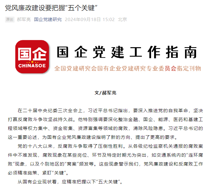 在二十屆中央紀委三次全會上,習近平總書記指出,要深入推進黨的自我革命,堅決打贏反腐敗斗爭攻堅戰持久戰。他特別強調要深化整治金融、國企、能源、醫藥和基建工程領域等權力集中、資金密集、資源富集等領域的腐敗,清除風險隱患。習近平總書記的這一重要論述,為國有企業黨風廉政建設指明了新的方向、提出了更高的要求。