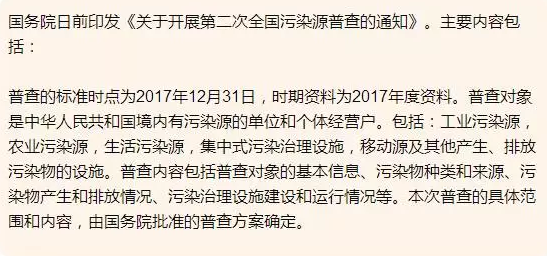 全國污染源普查是重大的國情調查,是環境保護的基礎性工作。開展第二次全國污染源普查,掌握各類污染源的數量、行業和地區分布情況,了解主要污染物產生、排放和處理情況,建立健全重點污染源檔案、污染源信息數據庫和環境統計平臺,對于準確判斷我國當前環境形勢,制定實施有針對性的經濟社會發展和環境保護政策、規劃,不斷改善環境質量,加快推進生態文明建設,補齊全面建成小康社會的生態環境短板具有重要意義。